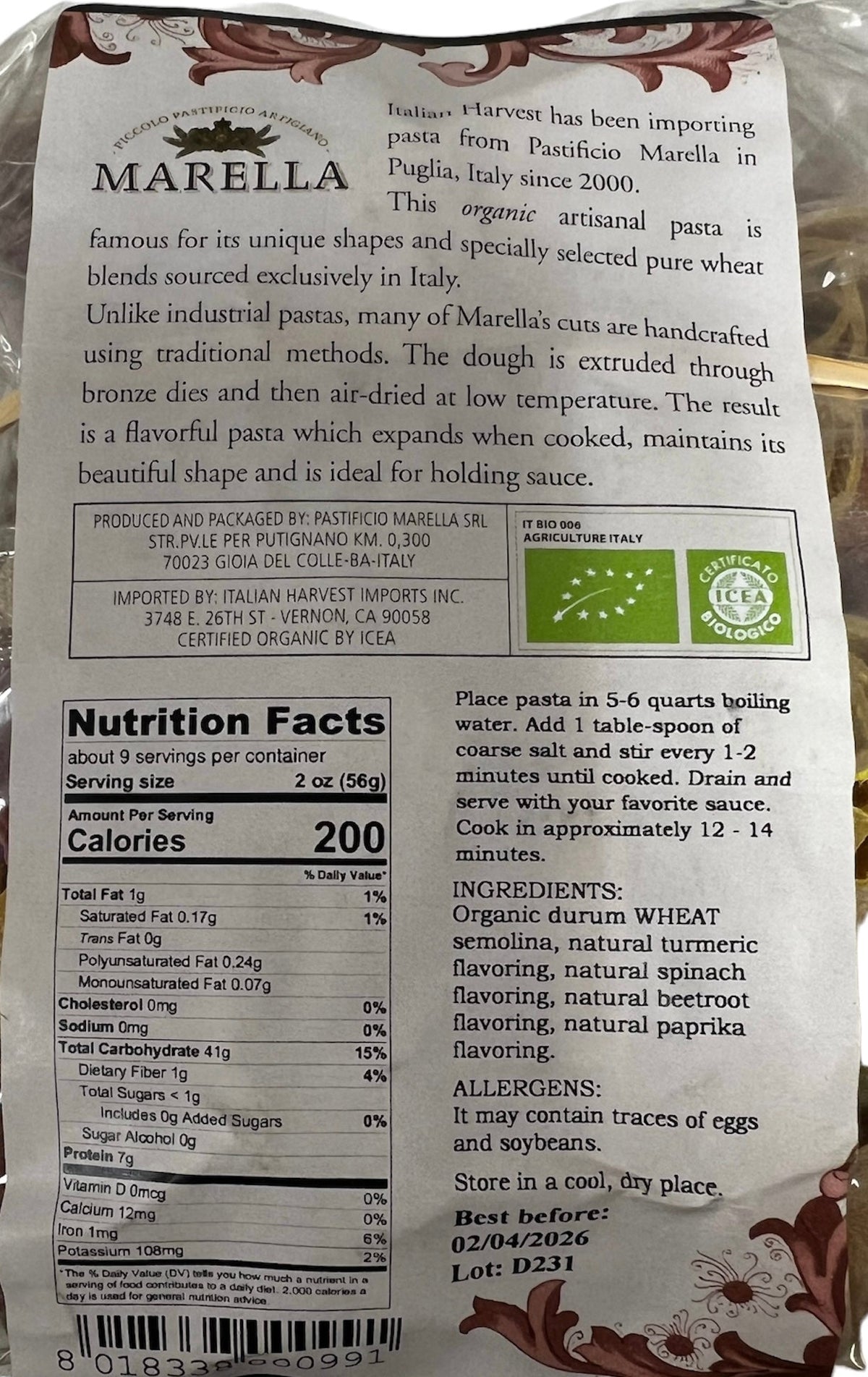 Durum wheat semolina, water, dehydrated tomato, chile pepper, spinach, paprika, beet root, and kurkuma.